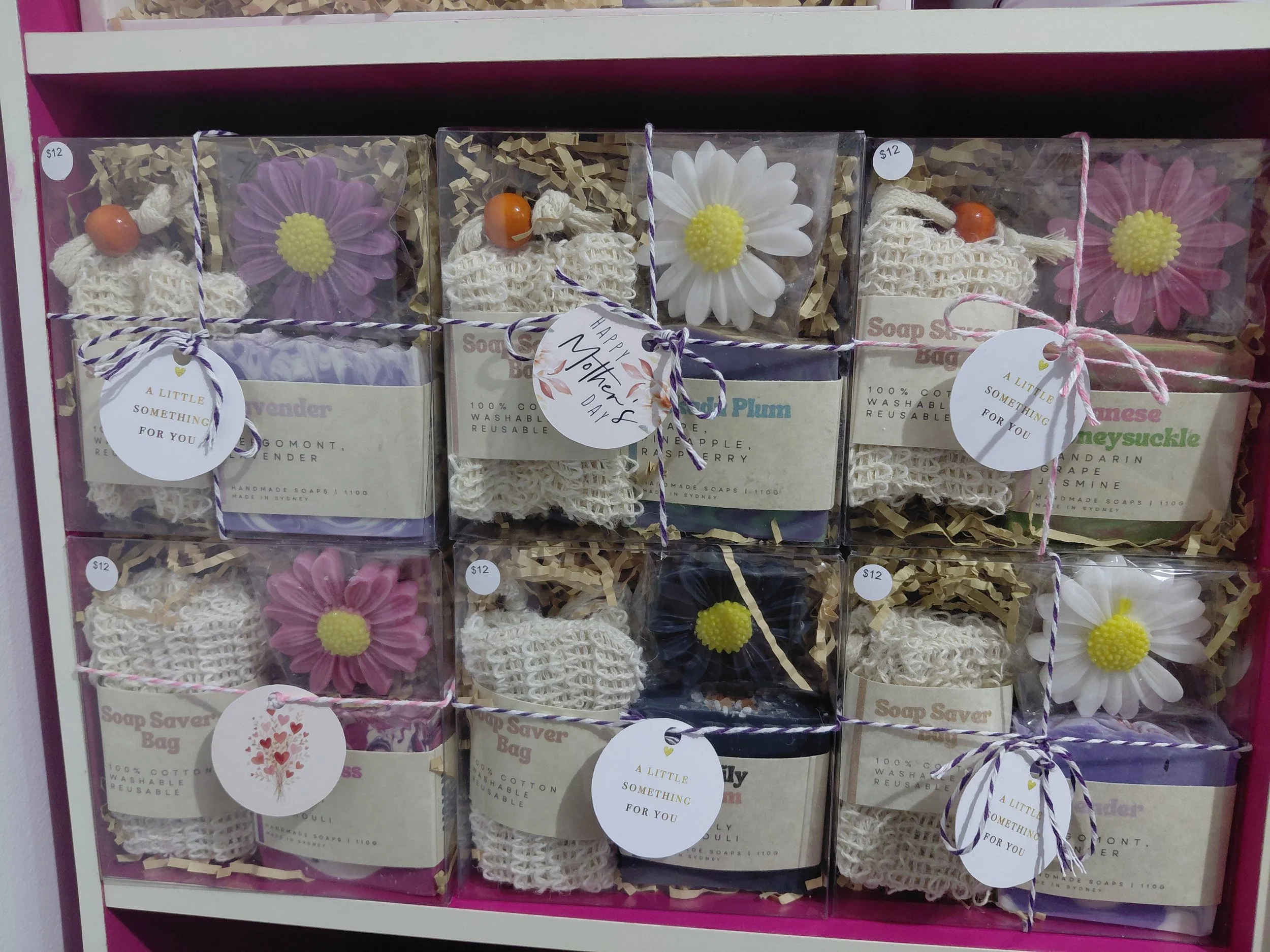 All Products › Soap gift pack Image 1 of 1 Soap gift pack $12.00 This pack contains a Handmade soap bar, soap saver bag and mini flower soap (randomly selected) Soap Fragrance: Floral Kiss Lavender Tigerlily Blossom Kakadu Plum Japanese Honeysuckle Add To Cart Added! This pack contains a Handmade soap bar, soap saver bag and mini flower soap (randomly selected)